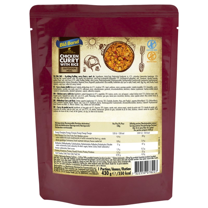 Vand, grøntsager 18 % (løg, gulerødder, majs, rød peber), kogt kyllingekød 15 % (kyllingekød, salt), tomatpuré, langkornet ris 10 % , rapsolie, iodiseret salt, karry 0,5%, hvidløg, smagsstoffer, fortykningsmiddel: guargummi, citronsaftkoncentrat, dextrose, farve: paprikaekstrakt. Kan indeholde spor af mælk, æg, hvede, soja, selleri og sennep.