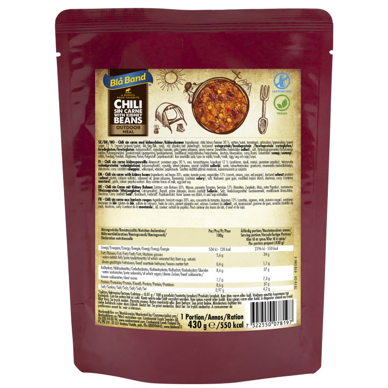 Røde bønner 30 %, vand, tomatpuré, grøntsager 12 % (gulerødder, løg, majs, rød peber), teksturerede hvedeproteiner (hvedegluten, calciumsulfat, konserveringsmiddel: natrium metabisulfit), rapsolie, grøn jalapeño, smagsstoffer (indeholder selleri og hvede), iodiseret salt, fortykningsmiddel: guargummi, modificeret majsstivelse, dextrose, karry (indeholder sennep), hvidløg, farve: paprikaekstrakt. Kan indeholde spor af mælk, æg og soja.