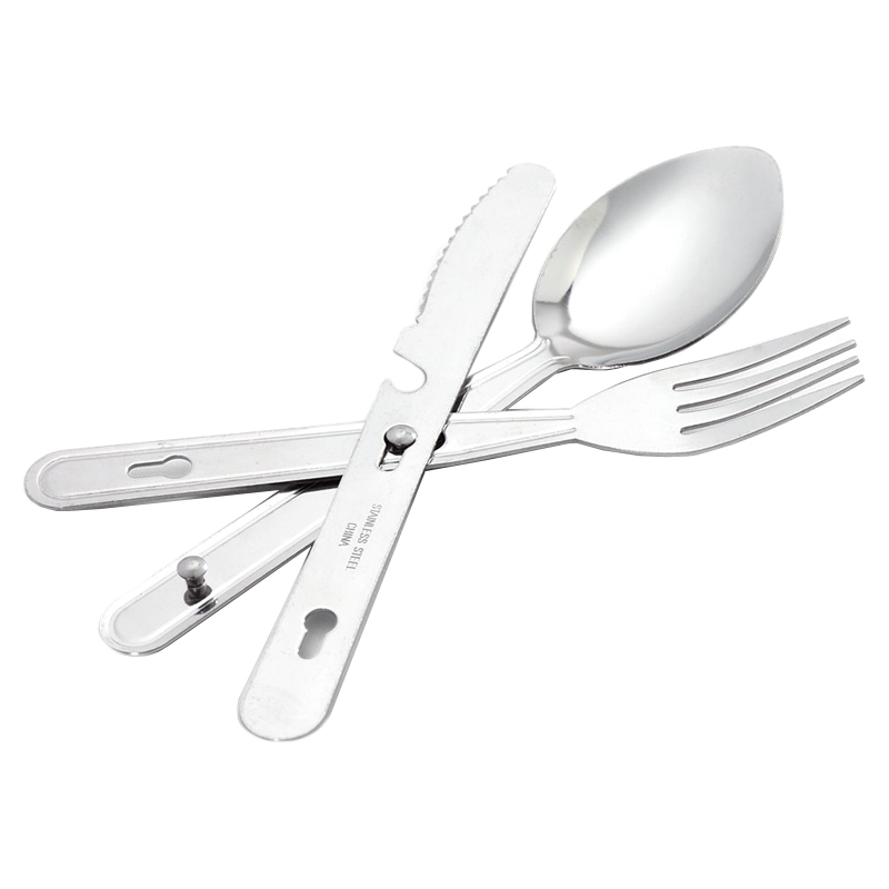 Denne tredelte rustfri stål kniv, gaffel og ske sæt klips sammen for nem transport og opbevaring.