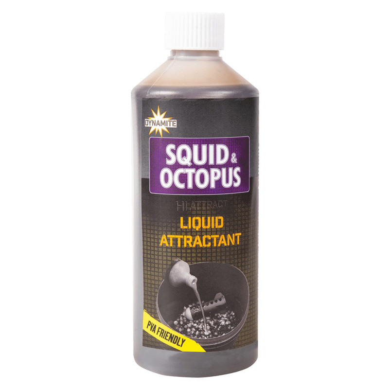 Dynamite Baits Squid & Octopus Liquid Attractant 500ml - Den flydende glug er designet til at matche den populære Squid & Octopus boilie-serie, men kan også bruges uafhængigt som et meget attraktivt tilsætningsstof. Væsken er fuld af naturlige ingredienser, herunder fiskeolier, og er perfekt til at booste krogagn og spod-blandinger samt til at blande groundbait eller putte i PVA-poser.