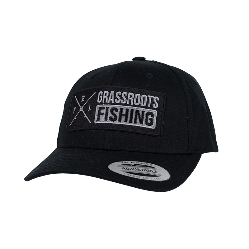 Sort Yupoong snapback med buet visir og broderet patch, stilfuldt design.