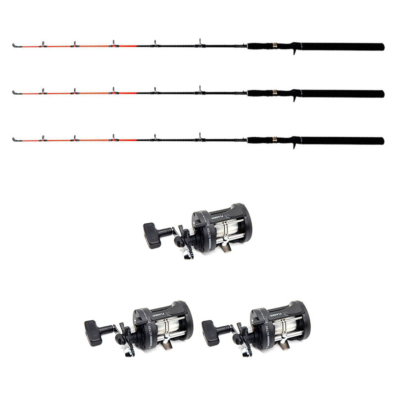 Fladen Warbird Maxximus 140 cm Högervev 3-Pack – et sæt med tre komplette isfiskesæt. Indeholder tre Fladen Maxximus Predator Ice Medium 140 cm Trigger 1sec stænger og tre Fladen Warbird GCT20 hjul med for-opspundet 0,40 mm nylonline.