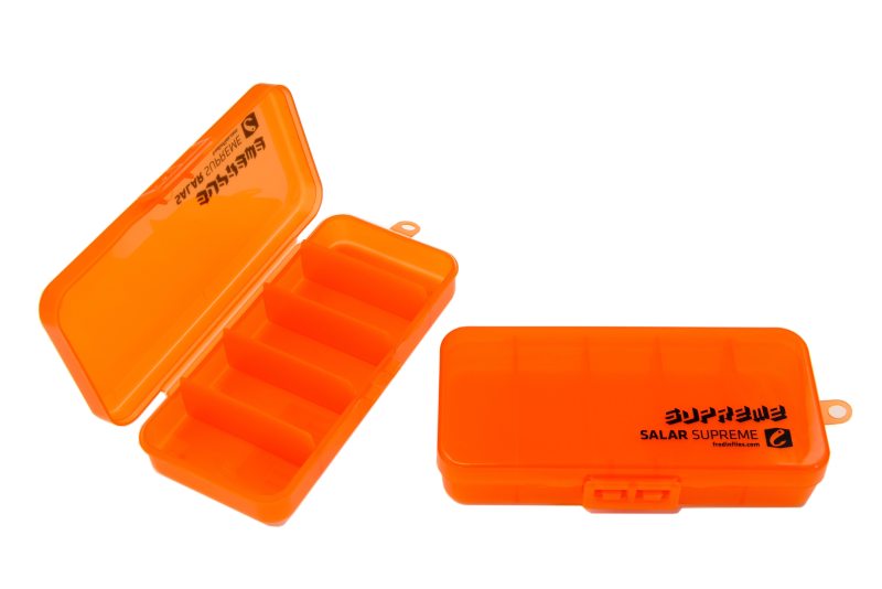 Den har fem lige store rum, perfekt til tørfluer, mikroer eller udelukkende til brug som krogboks. Dimensioner: 14x6x2. 5 cm. – Holdbar højkvalitets plastik – Kølig synlig orange farve – Glat at opbevare i lommerne