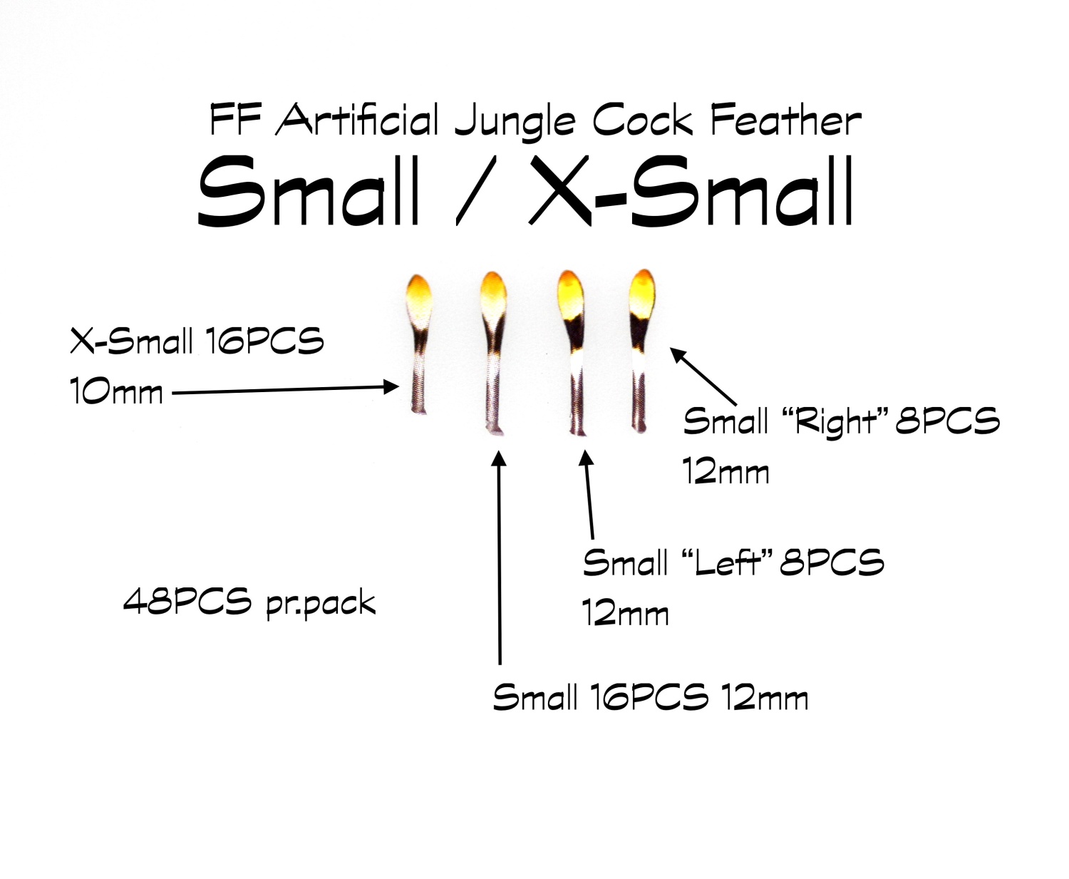 FutureFly Artificial Jungle Cock giver et realistisk og langtidsholdbart alternativ til ægte junglehane-fjer. Med en tynd og fleksibel stilk følger disse fjer let flueformen. Lavet af et stærkt, tyndt stofmateriale, der er blødt og ikke stift. Hver pakke indeholder 48 fjer i 4 forskellige størrelser, og størrelserne Small og X-Small inkluderer par med en drejning for at passe til både højre og venstre side af fluen.