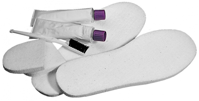 Et komplet sæt med filtsåler, sandpapir og to store tuber med vandtæt lim.