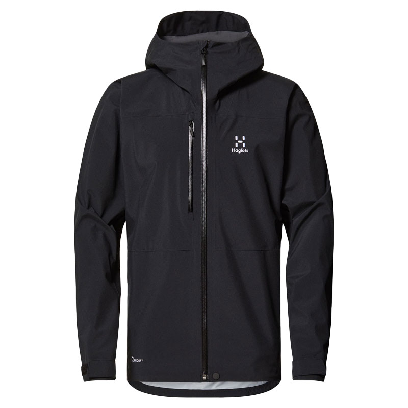 Haglöfs Front Proof Jacket Men True Black - Overskyet himmel på vandrestien? Med denne lette og pakbare skaljakke er det ikke noget problem. Den er lavet af et slidstærkt trelags PROOF™-genbrugspolyesterstof med en glat finish og genbrugsmembran, der giver åndbar vejrbeskyttelse. Ventilation under ærmerne hjælper dig med at holde dig komfortabel, når du er på farten. Den har også en justerbar hætte og et sæt håndlommer med lynlås til kolde hænder eller snacks.