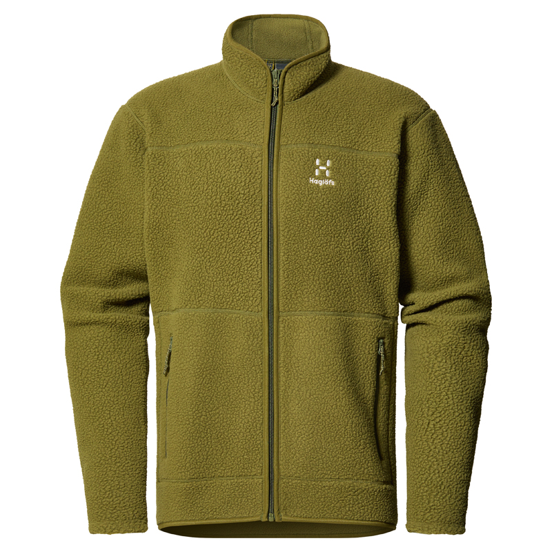 Haglöfs Mossa Pile Jacket Men Olive Green - Her forenes komfort, stil og udendørs parathed. Denne jakke er lavet af et isolerende, genanvendt polyesterluvmateriale, der ånder godt og tørrer hurtigt - egenskaber, der gør den velegnet til en bred vifte af aktiviteter.