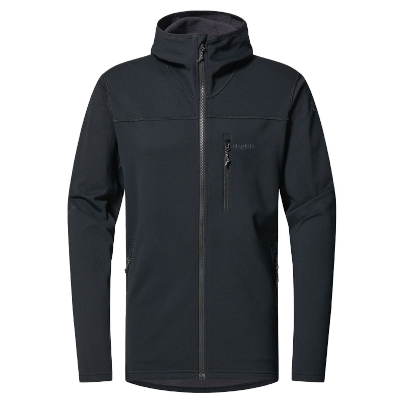 Haglöfs Rosson Mid Hood Men True Black - En stilfuld og blød mellemlagsjakke til vandreture og udendørsaktiviteter. Den er designet til at fungere som et alsidigt basislag i dit outdoor-udstyr. Brug den alene eller som et lag.