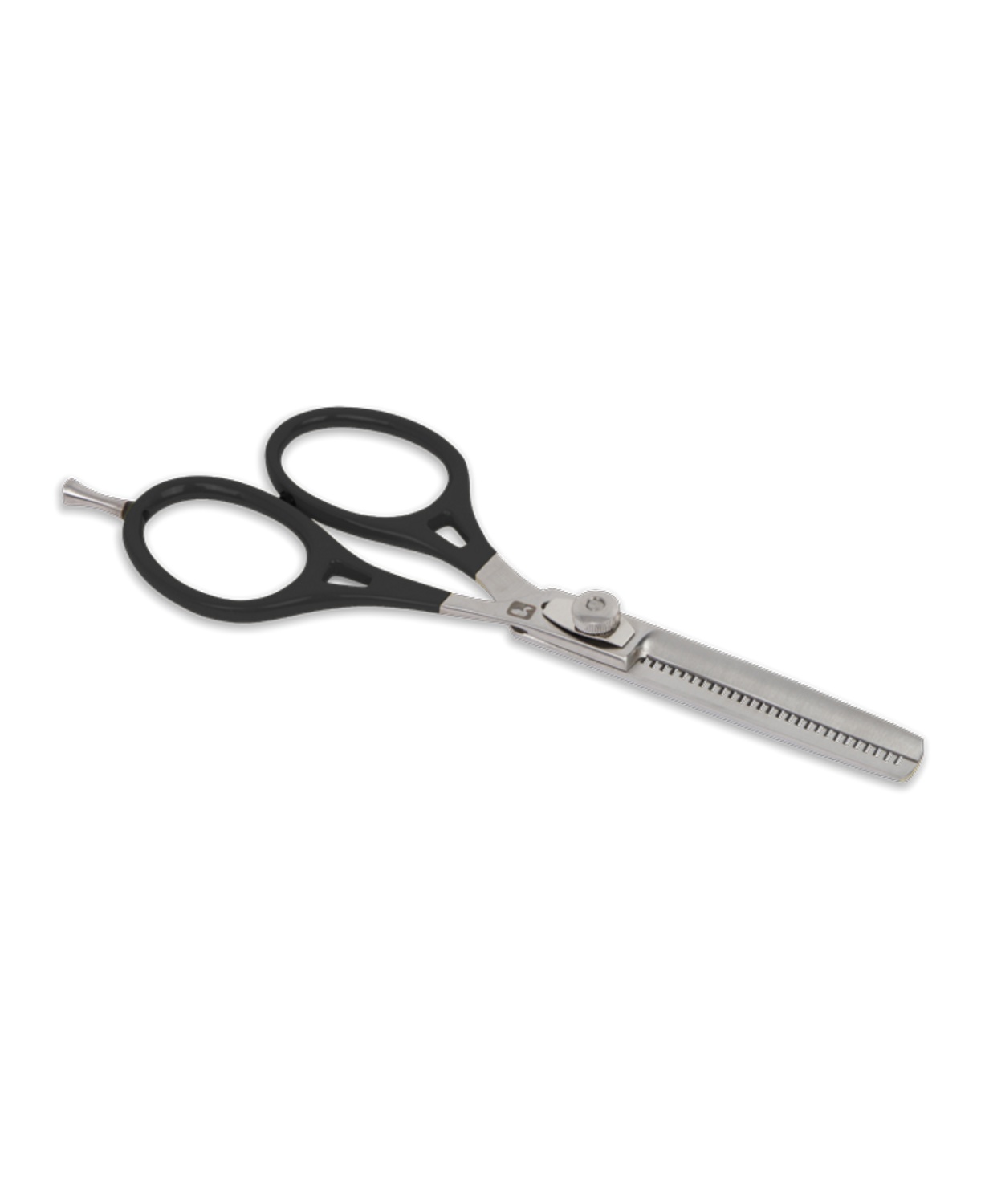 Loon Ergo Prime Tapering Shears w/ Precision Peg - Black giver præcision, når du taperer og tynder materialer. Det ene blad har tænder, så du kan tynde materialerne uden at efterlade skarpe linjer, mens det andet blad er glat for at sikre rene snit. De brede blade giver ekstra stabilitet, og de ergonomiske håndtag passer til store hænder. Precision Peg kan fjernes og giver øget kontrol. Bladene er håndslebet i USA for optimal ydeevne.