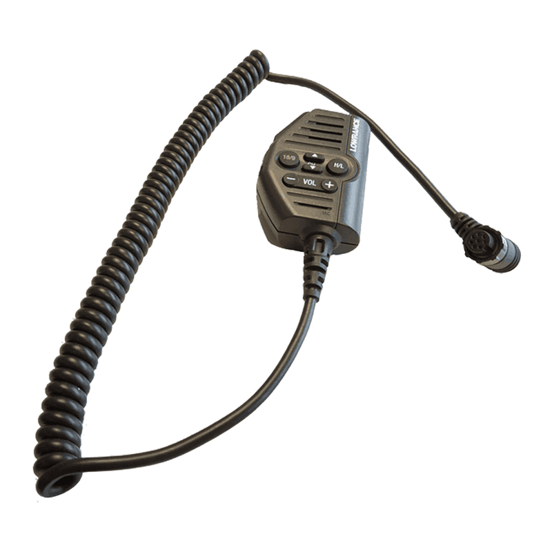 Lowrance Link-9 Remote Mountable Fist Mic. Kan tilsluttes foran eller bag på radioen, og valgfrit forlængerkabel gør det muligt at montere radioen og mikrofonen adskilte steder.