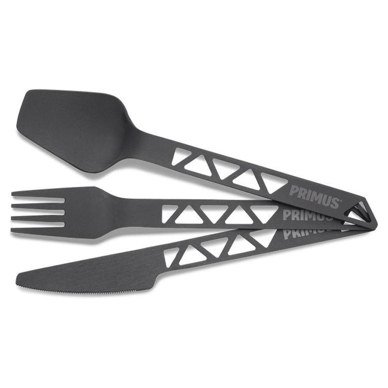 Primus TrailCutlery Aluminium er en gaffel, kniv og ske lavet af hård-anodiseret aluminium af høj kvalitet. Lav vægt og fremragende holdbarhed. En strop holder orden på delene!