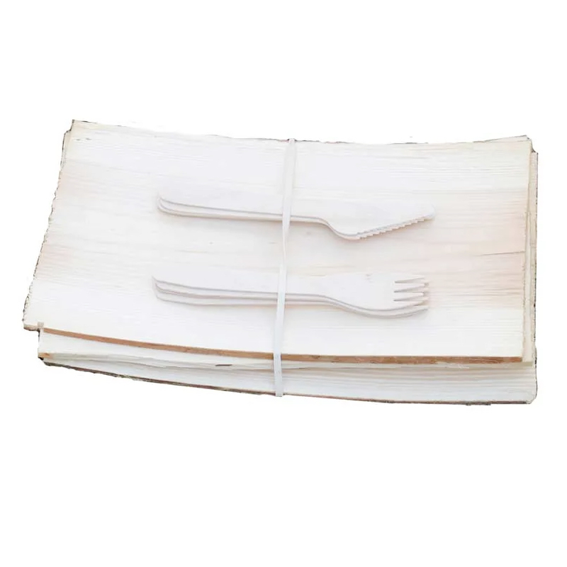 4 tallerkener med træbestik, 4 knive og gafler. 8 stykker bestik.