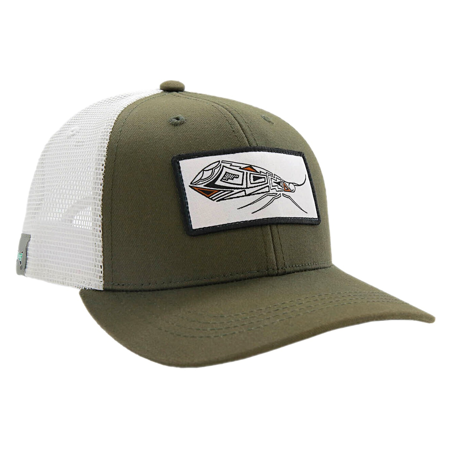 RepYourWater Pueblo Pottery Caddis er en klassisk kasket i grøn og hvid med struktureret pasform – inspireret af nattsværmere og keramikmønstre.