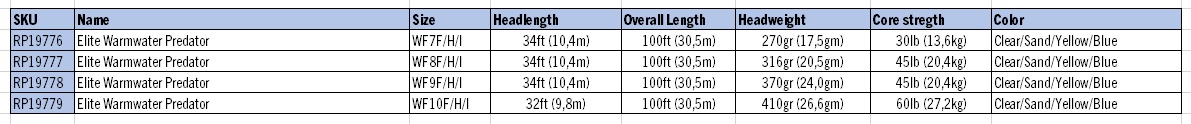 RIO Elite Warmwater Predator WF Flyt/Hover/Intermediate er udviklet til at gøre det nemmere at kaste store fluer i varmt klima. Linen har en stiv DirectCore-kerne for maksimal kontrol samt SlickCast-belægning for længere kast og holdbarhed.