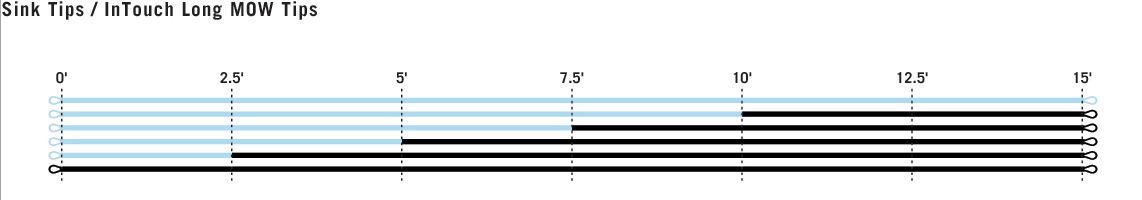 RIO’s InTouch Long MOW Tips er 15 fod lange spidser med forskellige flyde- og synkesektioner, der er ideelle til at kaste store fluer under blæsende forhold. Disse lange spidser er perfekte til Spey-stænger på 13 fod eller længere, og for dem, der finder almindelige MOW-spidser for korte. Med ultra-lav strækning ConnectCore-teknologi forhindrer de ankerudspring og giver maksimal kontrol.