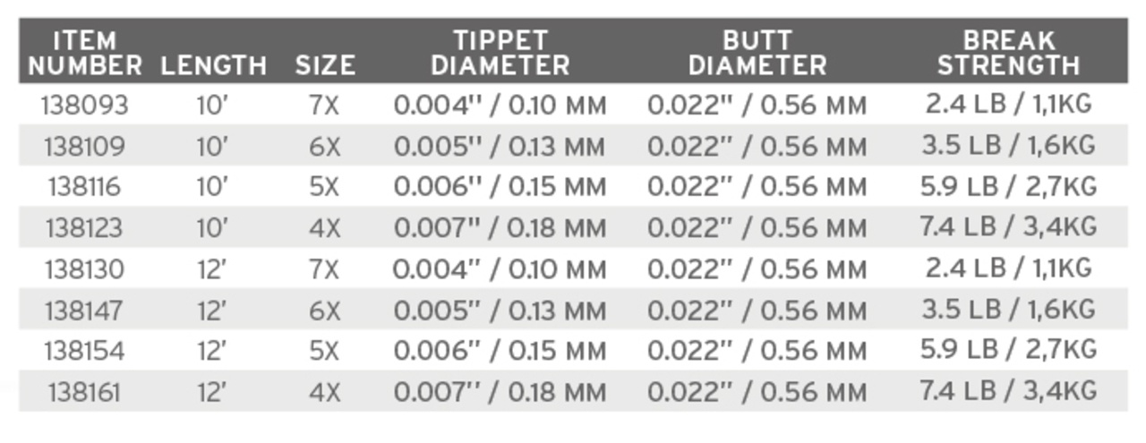 SA Absolute Trout Finesse Leader 10' fra Scientific Anglers er designet til at levere en præcis præsentation ved tørflue- og nymfefiskeri. Fortommen er fremstillet med en copolymer-blanding, der reducerer vandoptagelsen og giver op til 29 % højere brudstyrke, når den er våd. Den gennemsigtige farve gør den mindre synlig i vandet, hvilket giver bedre præsentation. Desuden giver den 40 % stærkere knuder end konkurrenternes.