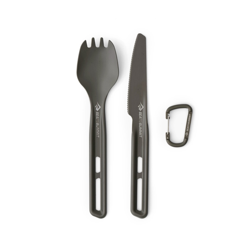 Sea To Summit Frontier UL Cutlery Set 2pcs Spork And Knife - Det 2-delte Frontier-bestik kombinerer en kniv og en spork til de backcountry-kokke, der gør mere med mindre. Hårdt anodiseret flyaluminium gør disse redskaber lige så stærke, som de er lette; sea to summit-designet gør dem ergonomisk funktionelle. En mini-karabinhage holder sættet sammen, når redskaberne opbevares efter brug.