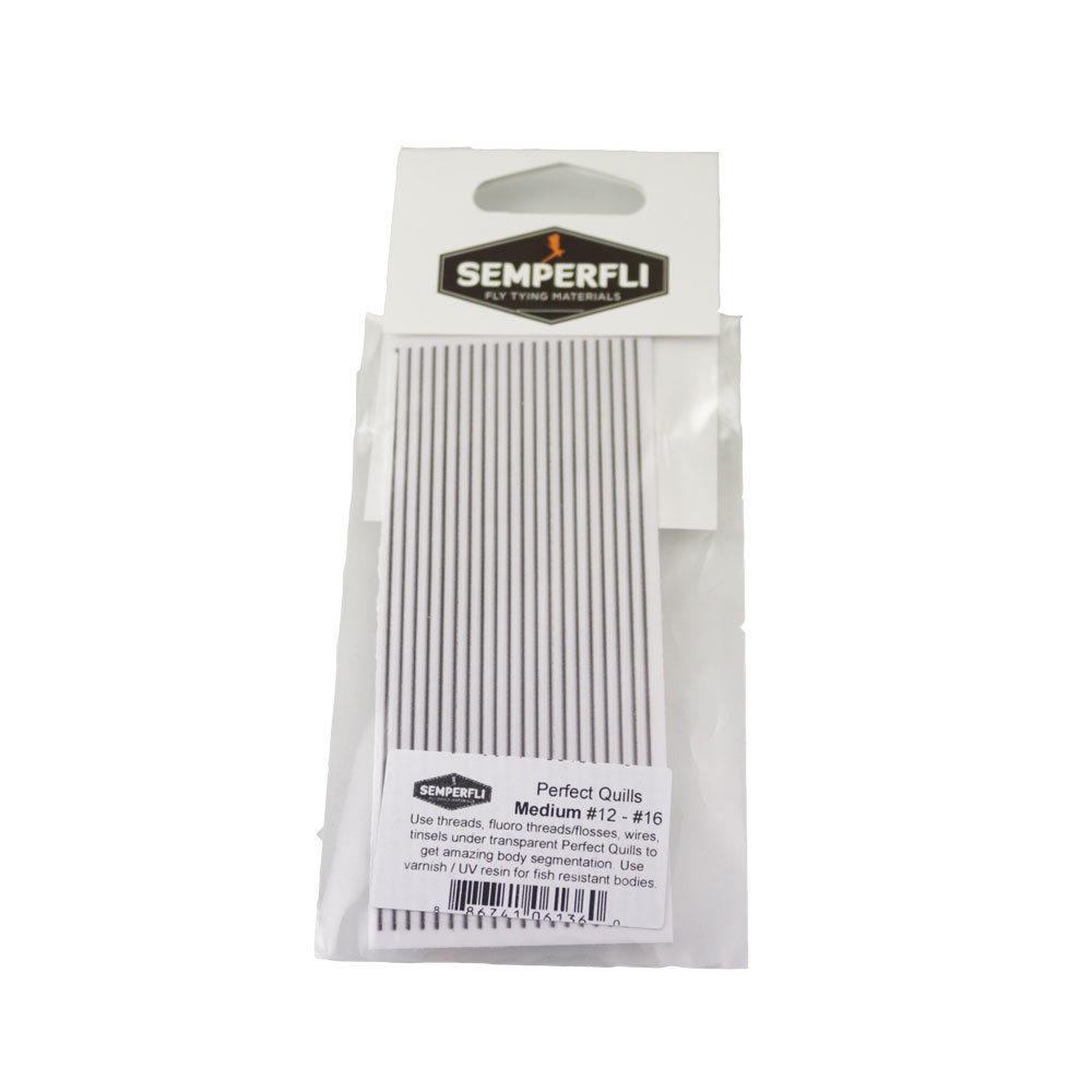 Semperfli Perfect Quills Synthetic er det ideelle valg for fluebindere, der ønsker at skabe realistiske og smukt segmenterede kroppe på deres tørfluer og nymfer. Disse syntetiske quills er en mere holdbar og længere variant af traditionelle påfuglequills. De har en klæbende bagside, der gør dem lette at påføre og vikle omkring fluens krop. Den gradvise farvetapering gør, at de mørkere segmenter bliver tykkere, hvilket efterligner udseendet af naturlige påfuglequills. Perfect Quills fås i tre størrelser, der passer til en række fluestørrelser: Small til størrelse #22-#16, Medium til størrelse #16-#12 og Large til størrelse #12-#8.