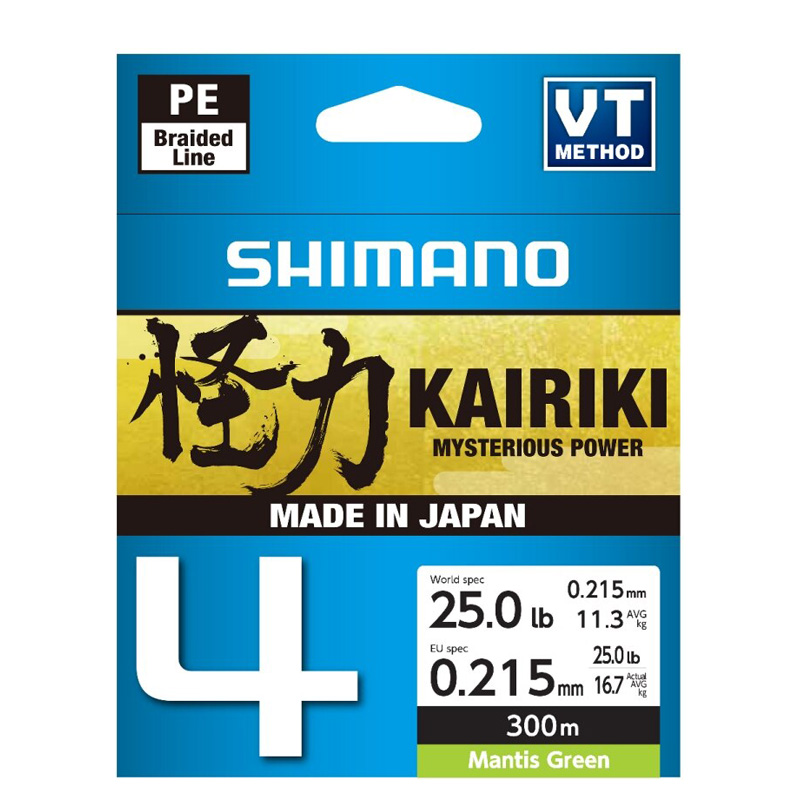 Den nye Shimano Kairiki 4 er en fornyet 4-bærer fletning, som er produceret i Japan og nu har en “VT-konstruktionsmetode” fletningsteknologi. Det er en meget stærk og glat PE-line, som er perfekt til at kaste store afstande. Den fås i diametre fra 0,06 mm op til 0,315 mm med en svimlende brudstyrke på 29,8 kg. Den har de perfekte egenskaber til spinning i både fersk- og saltvand, da den er meget følsom og meget glat, hvilket også resulterer i støjreduktion. Der vil også være to ekstra farver tilgængelige ved siden af Mantis Green og Steel Grey, nemlig en meget synlig Orange og Multi Color. Multi Color er især interessant til fiskeri på større dybder. På grund af glatheden og den lave diameter er Kairiki 4 en fantastisk linje til jigging, da den har lav vandmodstand og på grund af den maksimale strækning på < 3,0 %, den er også meget følsom.