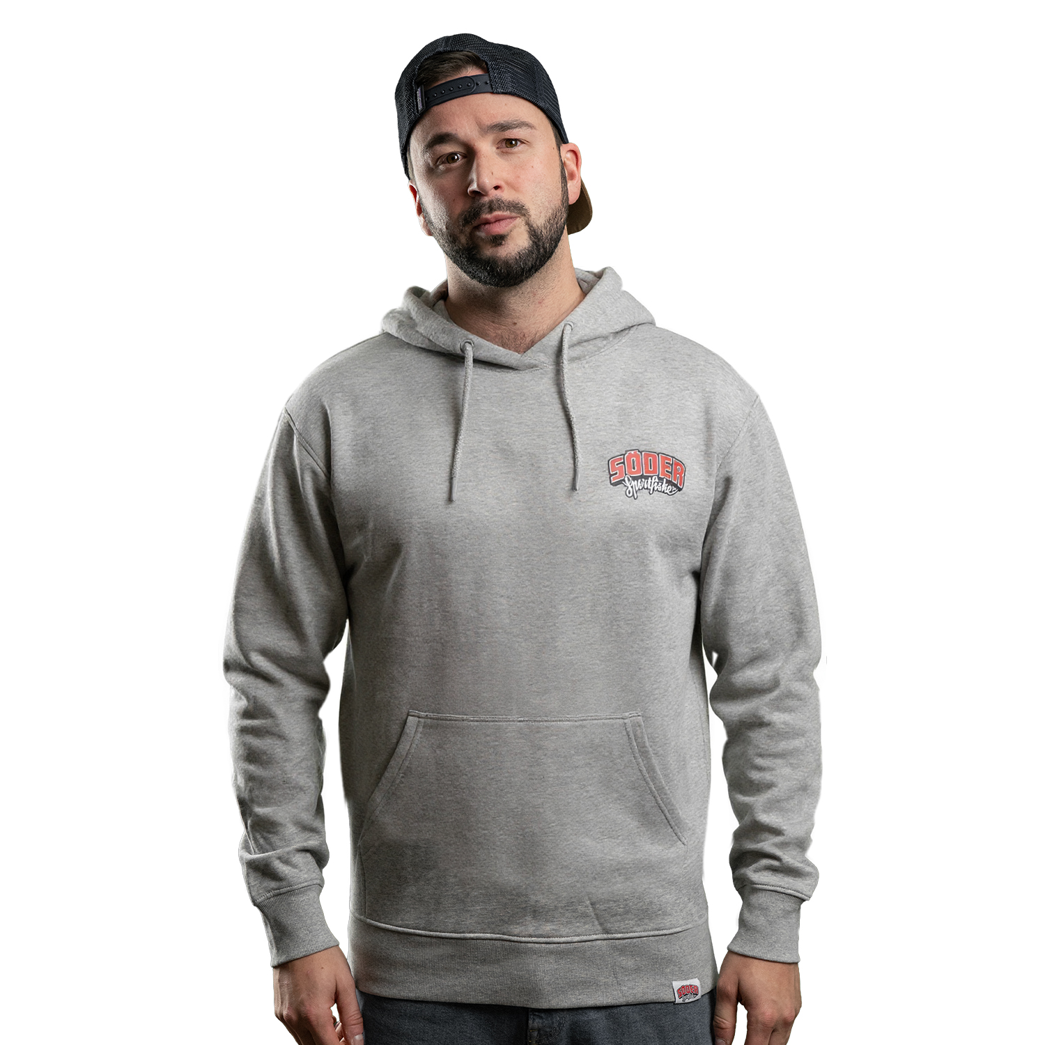 Denne hoodie har tryk på bryst og ryg og er lavet i 80 % bomuld og 20 % polyester. Fås i grå og sort, hvor sort kommer i to forskellige versioner.