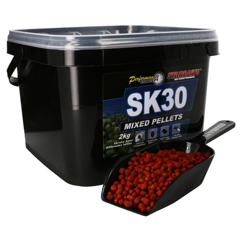 Starbaits PC SK30 Pellets Mixed 2kg - Formuleret af høj kvalitet kød råvarer kendt for deres attraktive principper såsom: tørret fiske måltid ved høj temperatur, opløselige fiske protein ekstrakter, marine ekstrakter, og associeret med opløselige attraktive forbindelser fra blæksprutte og krill, har "SK 30" en profil af aminosyrer og fedtsyrer, der klassificerer det som et uundværligt agn i udvælgelsen af store fisk på en station.