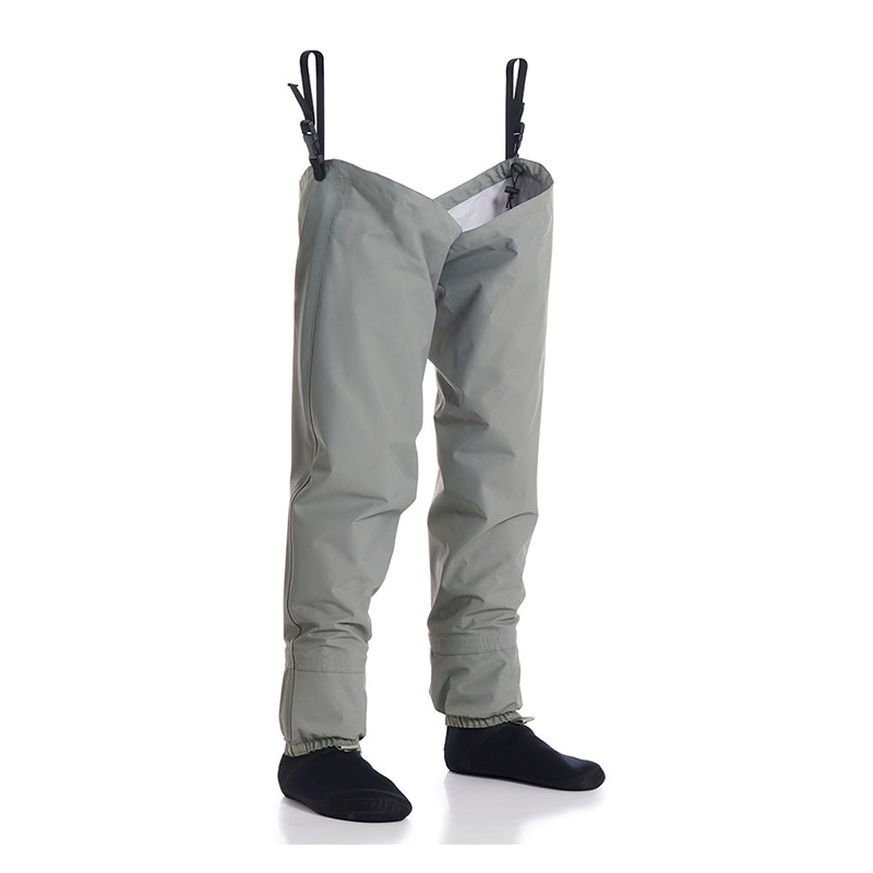 Materialet er vandtæt og åndbart F4 stof med PFC-fri C0 DWR-coating, som hjælper med at holde ydersiden tør og reducere fugtophobning under jakken. De anatomisk formede neoprensokker giver en mere behagelig pasform i dine vadestøvler og mindsker risikoen for folder og kuldezoner.