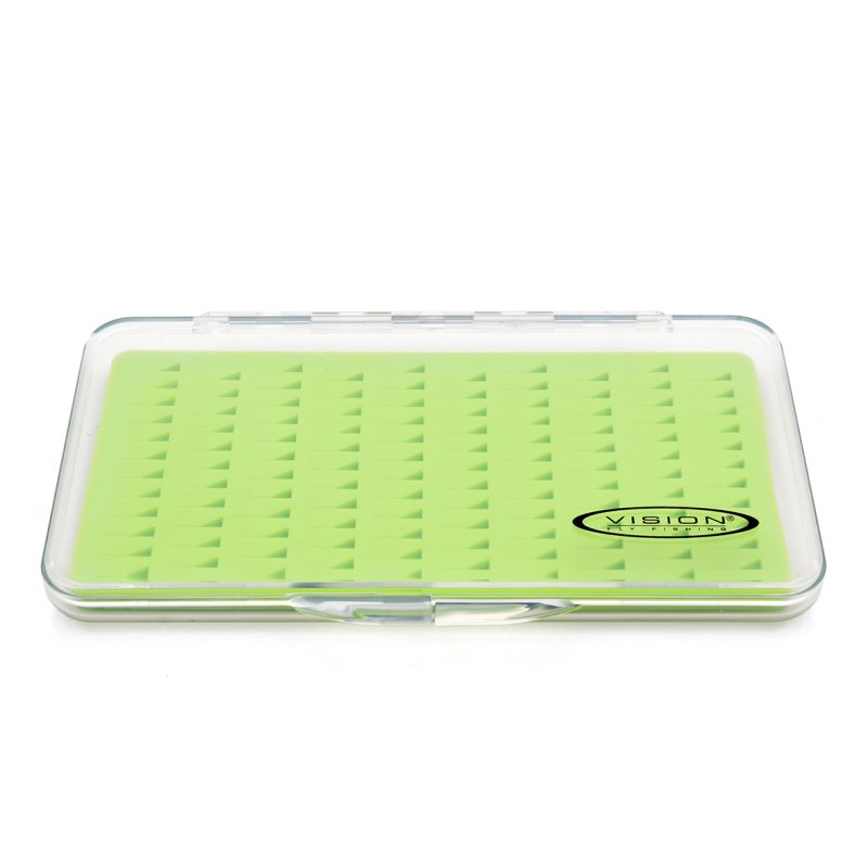 Vision Slim Nymphmaniac Silicon er en tynd og smart flueæske, perfekt til opbevaring af nymfer. Magnetbunden forhindrer fluer og kroge i at falde ud, og boksen fås i to størrelser. Designet i Nymphmaniac-grøn og passer nemt i lommen eller vesten.