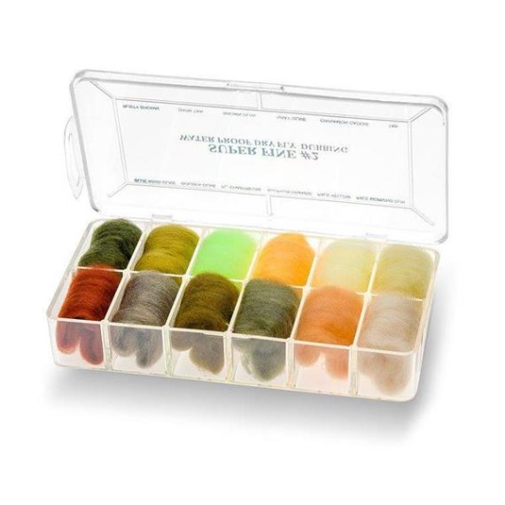 Wapsi Dispenser Super Fine #2 leverer 12 farver dubbing med permanent flydemiddel til tørfluer.