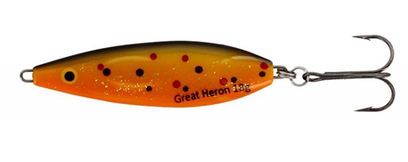Lige fra starten har det vist sig at være et yderst effektivt lokkemiddel - ikke kun til ørred og laks, men også til arter som asp, aborre og gedde. Great Heron kan hentes hurtigt eller langsomt. Uanset hastigheden har den en meget levende aktion, der udløser biddet. Ikke underligt at denne agn er blevet en af de mest populære agn i Skandinavien!