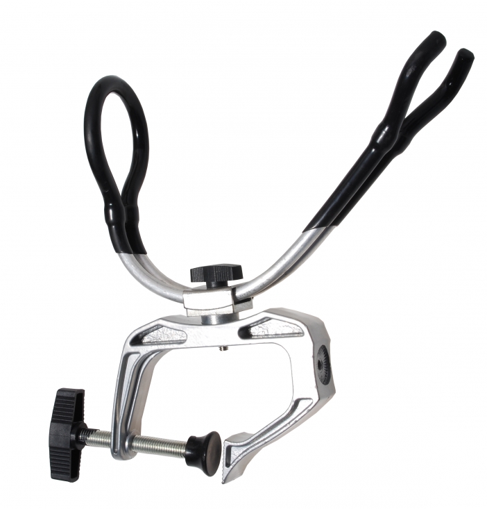 Stangholder med skrueklemme. Har fast beslag bagpå og foran, justerbar i beslaget.